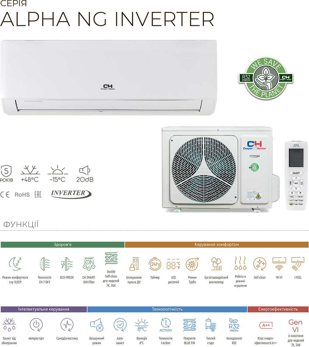 Инверторное управление. Премиальная комплектация Generation V (энергоэффективность класса А++). «CH 7-SKY Technology» - комплексная система фильтрации на основе семи фильтров широкого спектра действия. «CH SMART-ION Filter» - технология тотальной очистки воздуха нового поколения. Самоочистка внутреннего блока. ; I Feel — встроенный датчик температуры в пульт ДУ. Многоскоростной вентилятор; Широкий воздушный поток; Экстра низкий уровень шума 21 дБ. Защита вашего дома от замерзания: функция «+8 градусов», режим «SLEEP», функция «Авторестарт»; Защита oт обмерзания наружного блока. Премиальный пульт дистанционного управления с ночной подсветкой и отображение текущего времени суток. Wi-Fi модуль, для возможности управления кондиционером через Смартфон/Планшет. Фреон R32. Работа до -15°С. Пр-во Гон-Конг. Гарантия 5 лет.