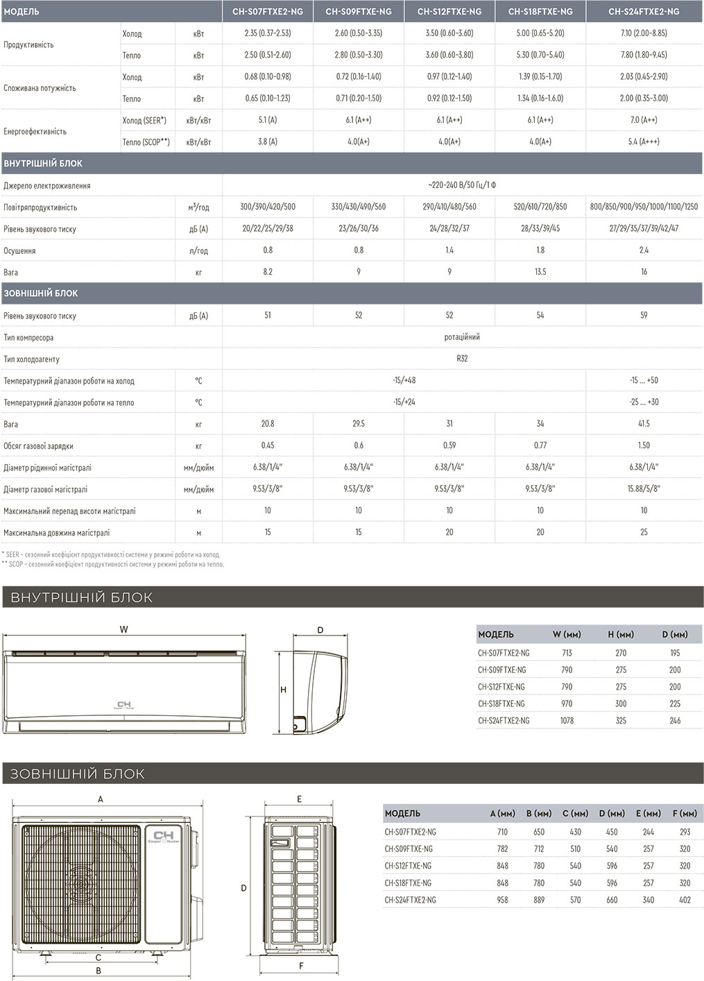| Споживана потужність при охолодженні 7/9/12/18/24 | 0.6/0.7/1.0/1.4/2. кВт |