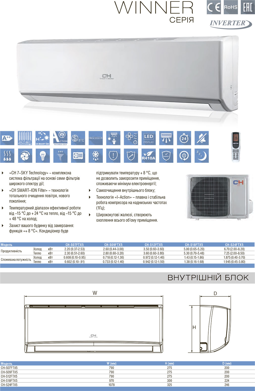 Инверторное управление. Премиальная комплектация Generation V (энергоэффективность класса А++). «CH 7-SKY Technology» - комплексная система фильтрации на основе семи фильтров широкого спектра действия. «CH SMART-ION Filter» - технология тотальной очистки воздуха нового поколения. Самоочистка внутреннего блока. ; I Feel — встроенный датчик температуры в пульт ДУ. Многоскоростной вентилятор; Широкий воздушный поток; Экстра низкий уровень шума 21 дБ. Защита вашего дома от замерзания: функция «+8 градусов», режим «SLEEP», функция «Авторестарт»; Защита oт обмерзания наружного блока. Премиальный пульт дистанционного управления с ночной подсветкой и отображение текущего времени суток. Фреон R410. Работа до -15°С. Пр-во Гон-Конг. Гарантия 5 лет.