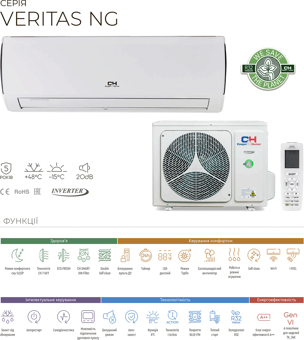 Кондиционер Cooper&Hunter серия Veritas. Инверторный компрессор, Энергоэффективность класса А++, Работа на обогрев до -15°С, Низкий уровень шума 20 дБ, Wi-Fi модуль, Фреон R32, Пр-во Гонконг, Гарантия 5 лет.