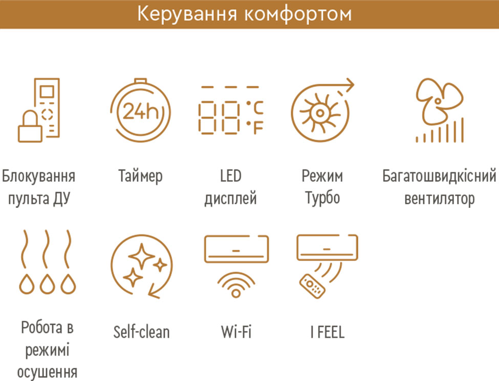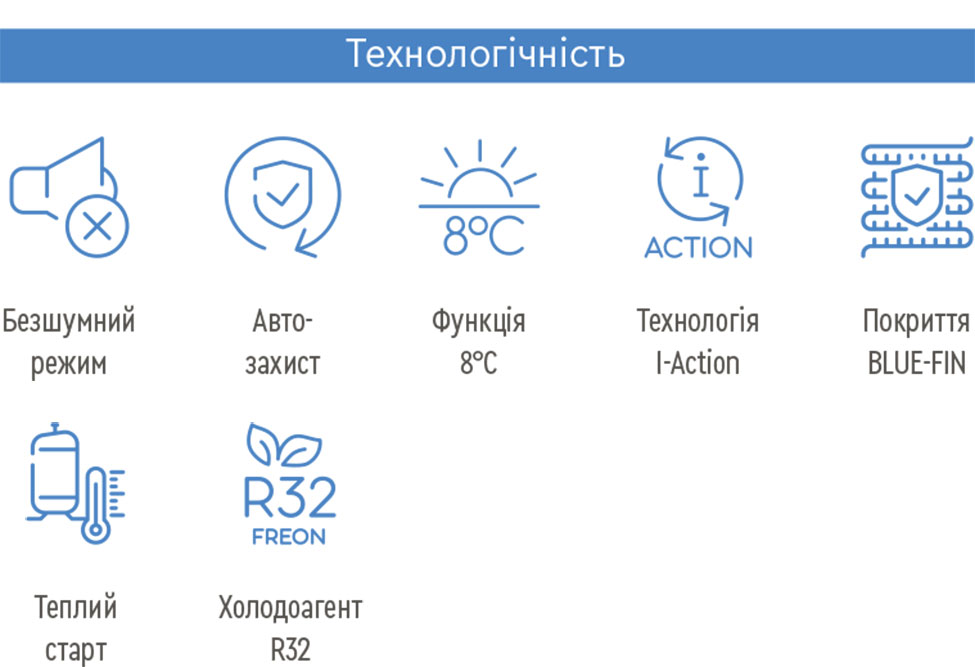 Особливості | Покриття "BLUE-FIN", "I FEEL" вбудований датчик температури в пульт, Захист від обмерзання зовнішнього блоку. |