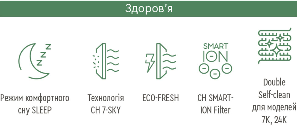 Премиальная комплектация Generation V. Инновационный современный дизайн блока. «CH 7-SKY Technology» - комплексная система фильтрации на основе семи фильтров широкого спектра действия. «CH SMART-ION Filter» - технология тотальной очистки воздуха нового поколения. Самоочистка внутреннего блока. «I FEEL» встроенный датчик температуры в пульт ДУ. Экстра низкий уровень шума 21 дБ. Многоскоростной вентилятор; Широкий воздушный поток; Защита вашего дома от замерзания: функция «+8 градусов», режим «SLEEP», функция «Авторестарт»; Защита oт обмерзания наружного блока. Премиальный пульт дистанционного управления с ночной подсветкой и отображение текущего времени суток.