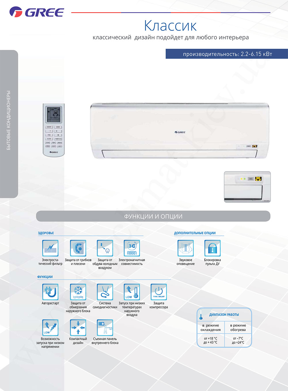 Кондиционеры GREE серия Classic Настенный кондиционер Gree серии Классик на озонобезопасном фреоне R-410A. Добротность и практичность, элегантный дизайн и безукоризненная работа. LED - дисплей на корпусе внутреннего блока позволяет получить подробную и наглядную информацию о параметрах работы кондиционера. Пр-во Китай. Гарантия 5 лет.