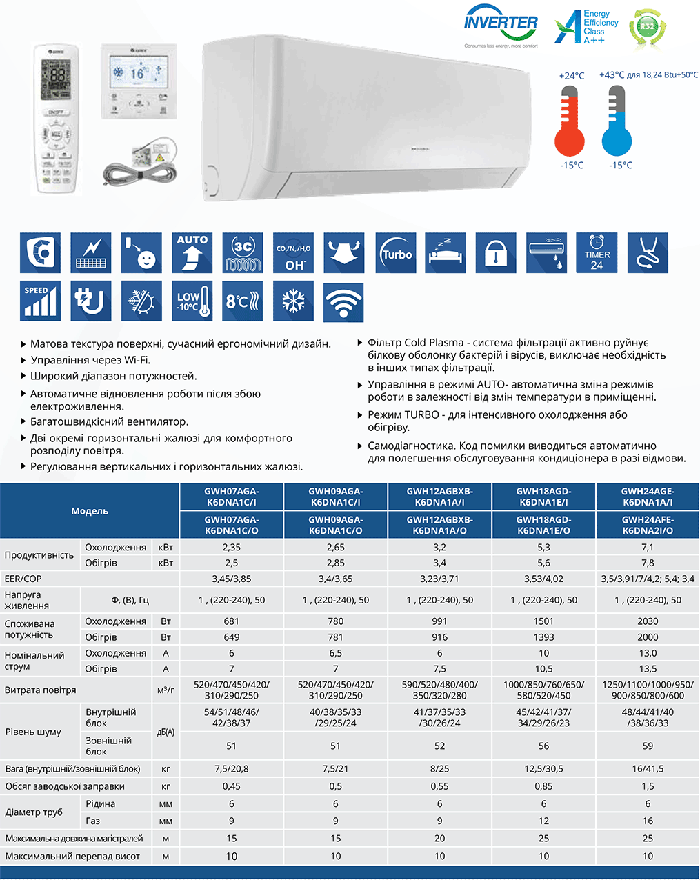 GREE Inverter. Комплексная система фильтрации на основе семи фильтров широкого спектра действия. Фильтр «Сold Plazma» - технология тотальной очистки воздуха нового поколения; Премиальный пульт дистанционного управления с новым эргономичным корпусом и ночной подсветкой; I Feel — встроенный датчик температуры в пульт ДУ. Многоскоростной вентилятор; Широкий воздушный поток; Защита вашего дома от замерзания: функция «+8 градусов», режим «SLEEP», функция «Авторестарт»; Защита oт обмерзания наружного блока. Wi-Fi модуль. Работа на обогрев до -15°С. Пр-во Гонг-Конг. Гарантия 5 лет.