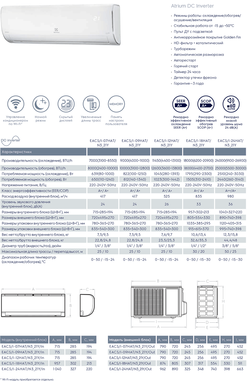 Кондиціонери Electrolux серії Atrium Inverter холод/тепло. Авторестарт, м'який старт, гарячий старт, низьковольтний пуск, низькотемпературний пуск, ширококутні жалюзі, автоматичне хитання вертикальних жалюзі, LED дисплей, пульт дистанційного керування, таймер 24 години, клас енергозбереження А+, захист від перепадів напруги, низький рівень шуму, фотокаталітичний фільтр, турбо режим, нічний режим, авто режим, самодіагностика, автоочищення, автоматичне розморожування. Wi-Fi (опція 970 грн) модуль. Захист від обмерзання зовнішнього блоку. Робота до -15°С. Пр-во Гонг-Конг. Гарантія 3 роки.
