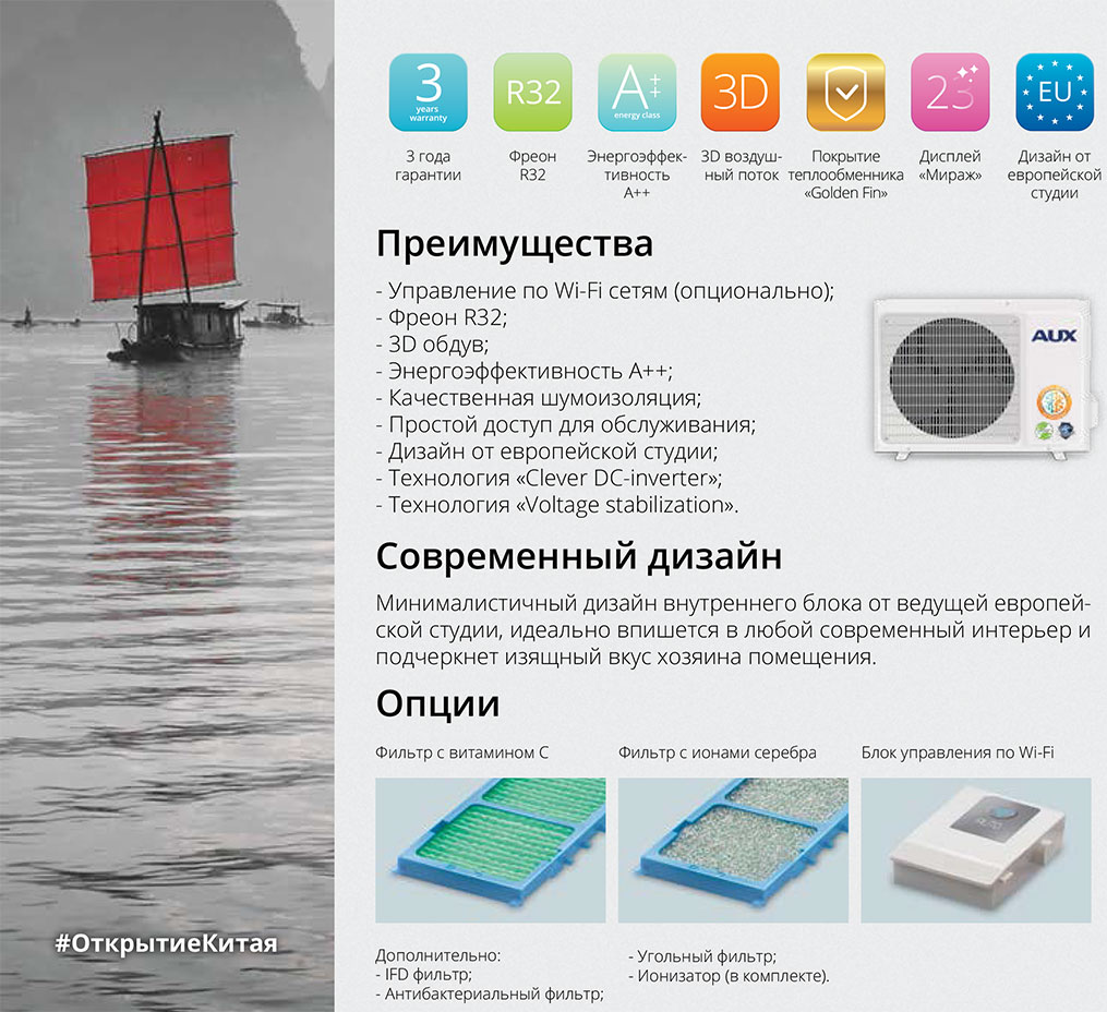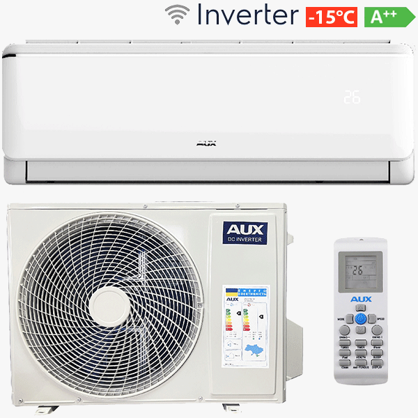 Кондиціонер AUX. Інверторний компресор, Енергоефективність класу А++, Робота на обігрів до -15°С, Wi-Fi модуль опція (970 грн), Фреон R32, Гонконг, Гарантія 5 років.