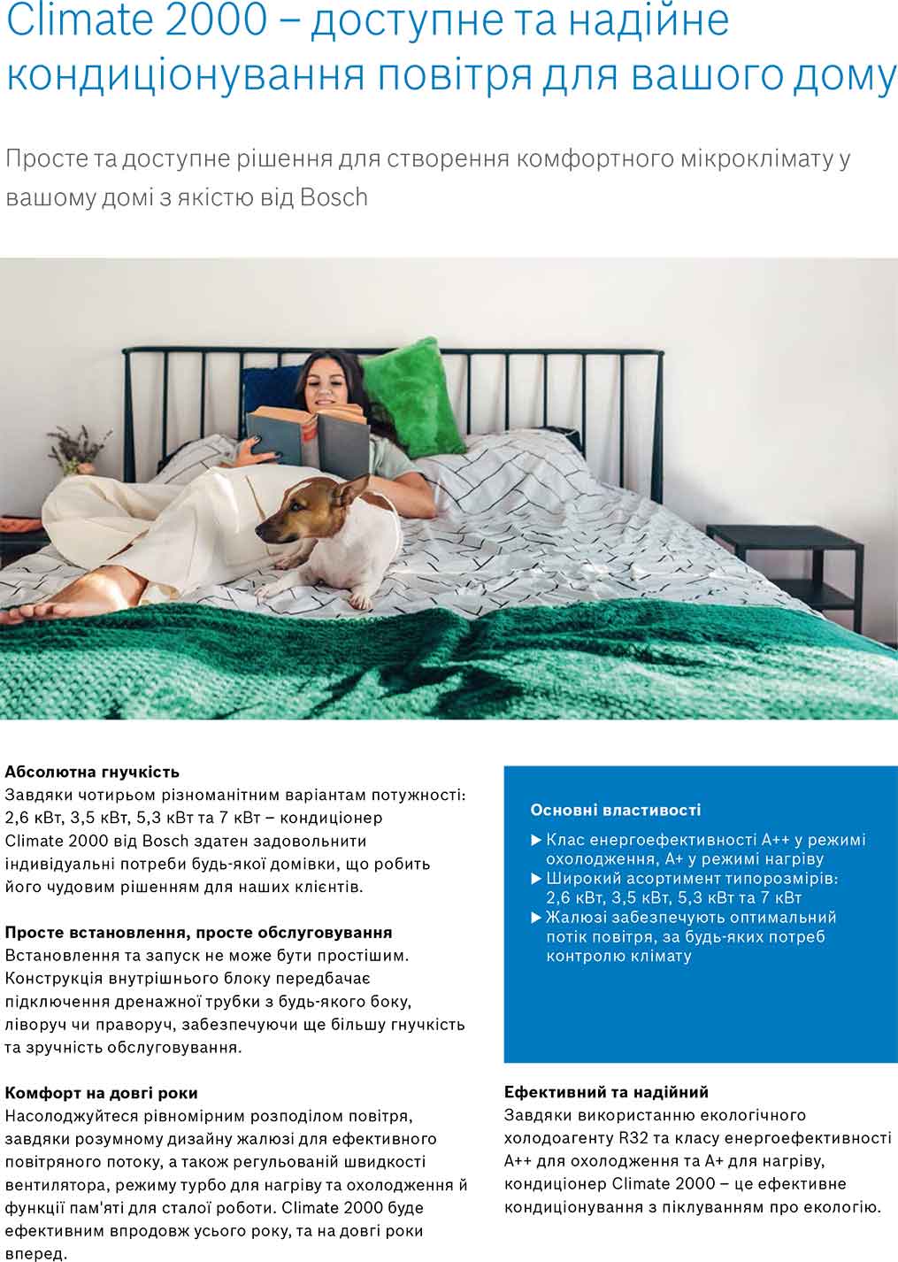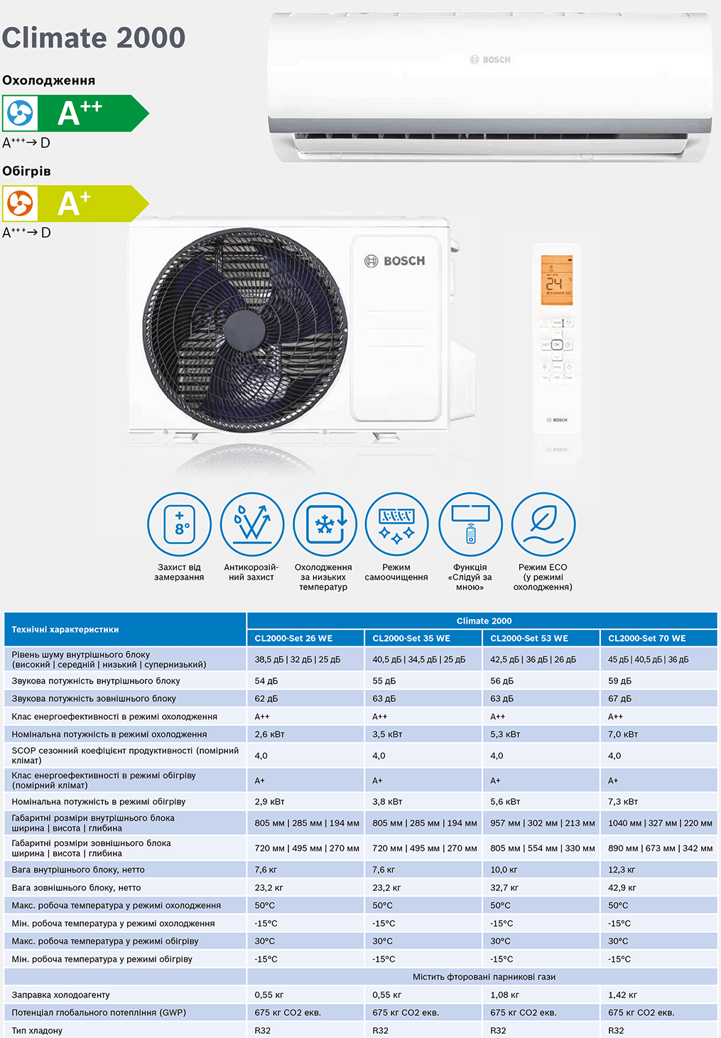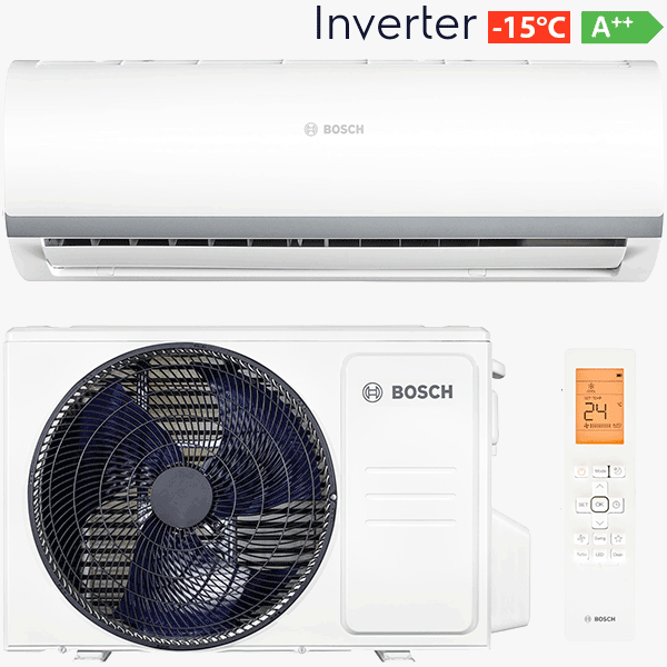 Кондиціонер Bosch. Інверторний компресор, Енергоефективність класу А++, Робота на обігрів до -15°С, Низький рівень шуму 24 дБ, Холод/тепло, самодіагностика, авторестарт, режим комфортного сну, функція Турбо, функція "Follow Me", гідрофільне покриття теплообмінника, запам'ятовування позиції, Фільтр, Гонконг, Гарантія 2 роки.